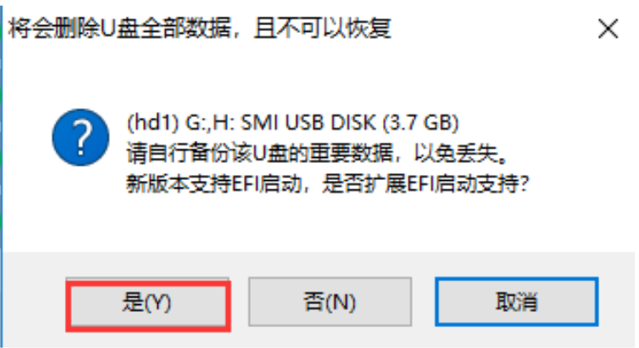 4、在点击一键制作后会弹出一个关于【U盘数据删除且不可恢复】的窗口,选择【是】。
