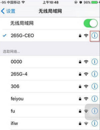 3、接着在当前连接的WiFi中点击右侧的“信息”图标,如图所示