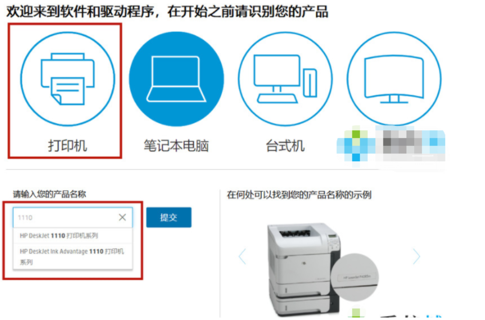 2.之后选择“打印机”,跳转进入新的页面。然后查看自己的打印机型号,一般打印机上面有显示。请输入你自己的打印机编号,如1110,在“产品名”中输入你自己的打印机。之后根据下拉选择具体的型号,点击“提交”;