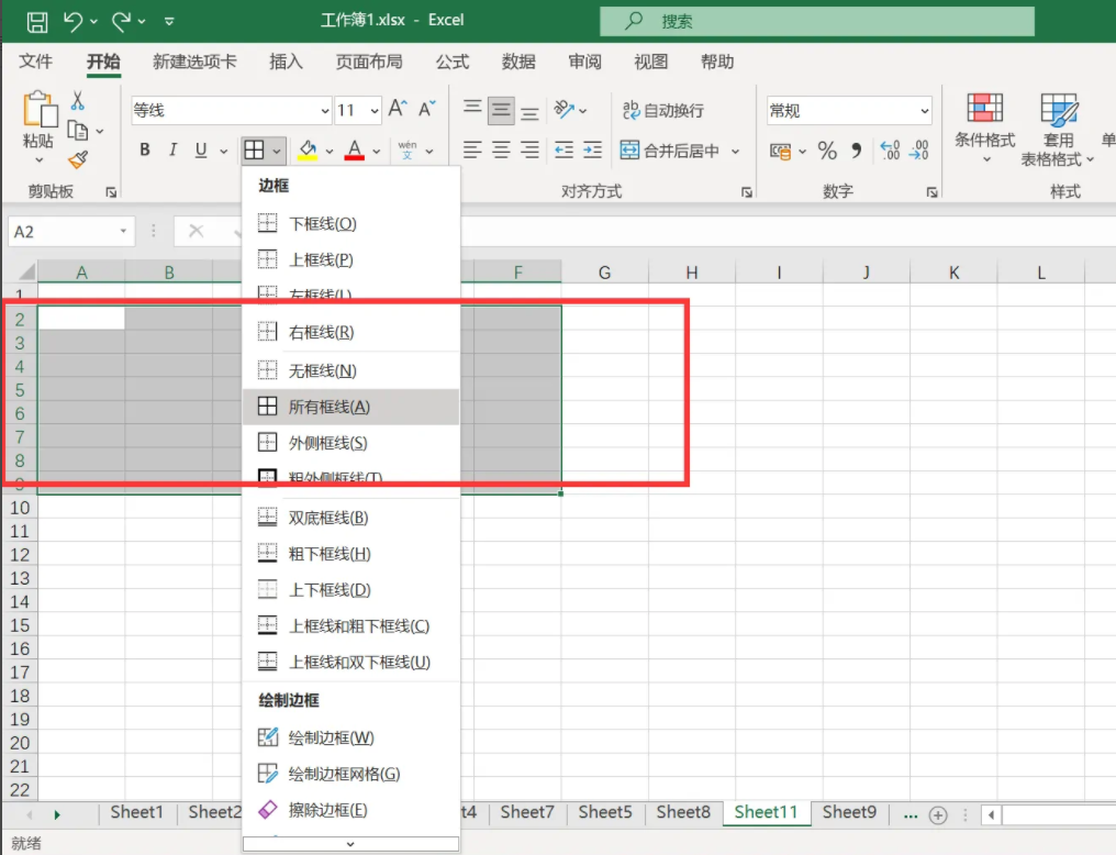 2、点击左上角”开始“后并且下拉选择所有框线,选中单元格区域添加上表格框线。