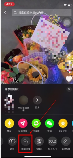 1、打开抖音,选择视频复制链接;