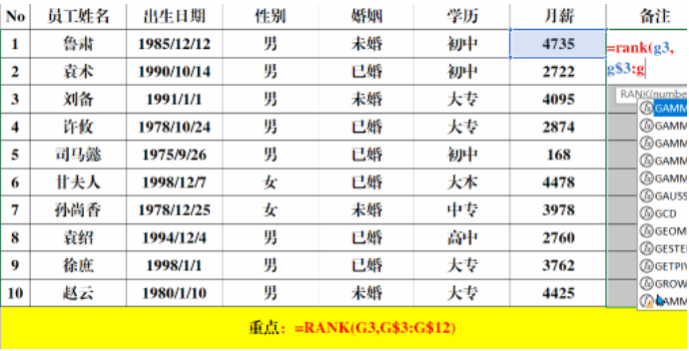 在目标单元格中输入公式:=RANK(G3,G$3:G$12)。