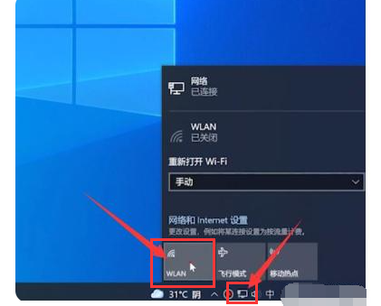 2、然后点开桌面右下角网络图标,点击WLAN。
