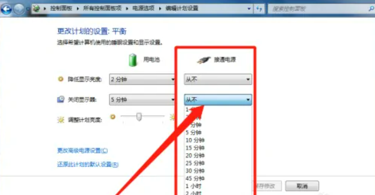 5、进入更改计划设置界面后,把永不调整成需要电脑自动黑屏的时间,设置完成。