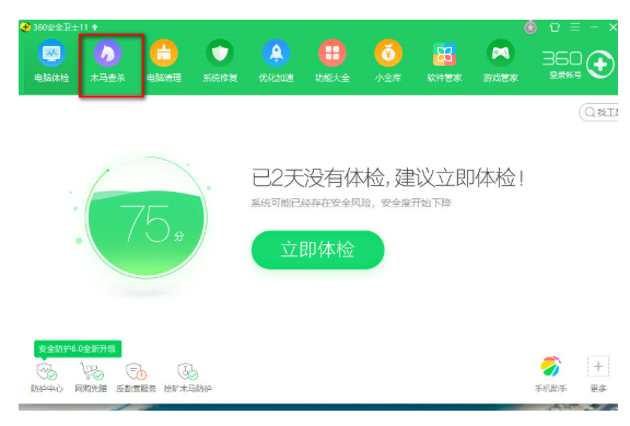 1、打开的360安全卫士软件,在主页面中点击木马查杀功能。