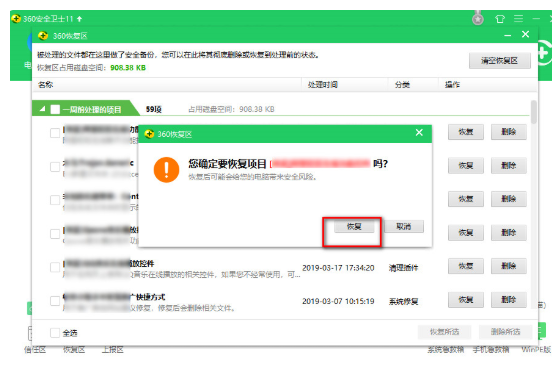 4、最后在弹出的提示框中再次点击恢复,就可以恢复被我们不小心卸载的软件啦。