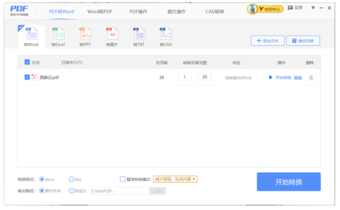 2、进入“PDF转Word”页面后,根据自身需要设置好转换范围、输出格式、输出路径后,就可以点击开始转换了。值得一提的是,转换选项中还提供了精准转换模式,即便PDF中是图片,也能将图片上的文字提取出来,并且尽可能的保留原来的排版。