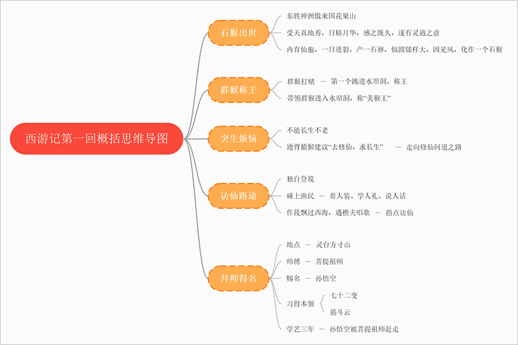 ??例如本文以“西游记第一回概括”为思维导图中心词进行扩展,那么我们可以根据这个中心内容延伸并拓展出许多与之相关的内容,而这些分支内容可以理解为对中心词的归纳。