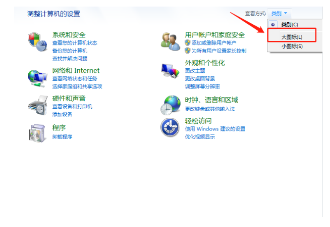 2.在控制面板页面中,将右上角查看方式更改为大图标。