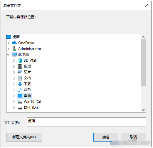 2、点击下载到后面的【浏览】,会弹出一个【浏览文件夹】的界面,然后选择保存文件夹的位置,这里我选【桌面】,最后点确定保存。