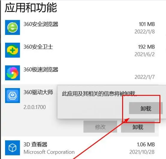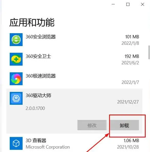 3、在应用以及功能页面下找到360驱动大师,选中软件点击卸载即可。