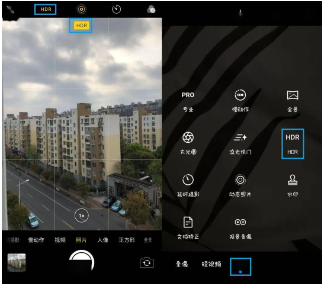 HDR模式开启方式很简单,直接打开手机相机,苹果手机在顶端点击HDR标识就能打开,安卓手机点击相机更多,页面显示HDR打开即可。