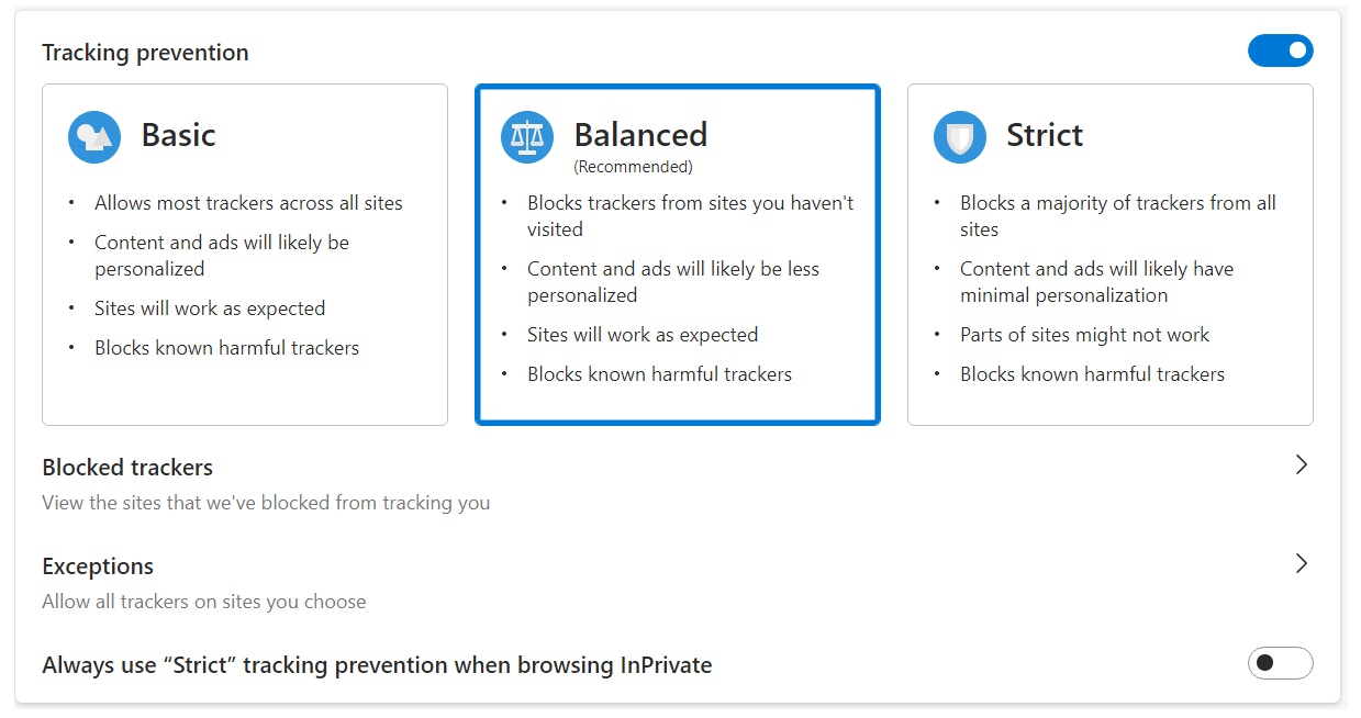 Edge的隐私设置更易于理解和管理。您可以在三个级别的跟踪防护之间进行选择,并查看被阻止的跟踪器列表。