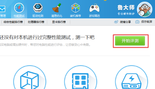 3、然后在软件的性能测试界面后,直接点击【开始评测】按钮,此时软件就会开始对电脑的处理器性能、显卡性能、内存性能和硬盘性能开始进行跑分了。