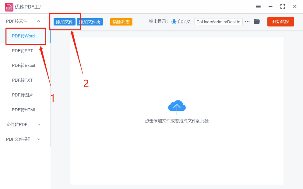 2、点击【PDF转Word】,然后点击【添加文件】,添加pdf文件到进行转换。