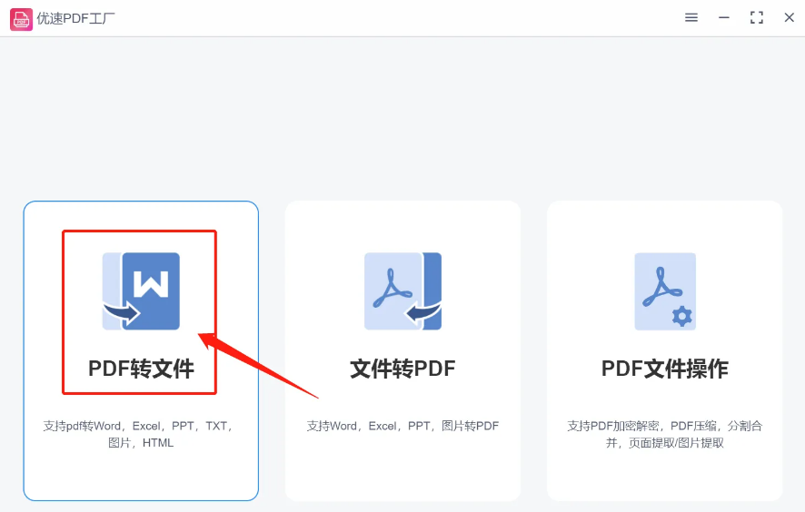 1、打开工优速PDF工厂,点击首页左边的【PDF转文件】功能进入内页。