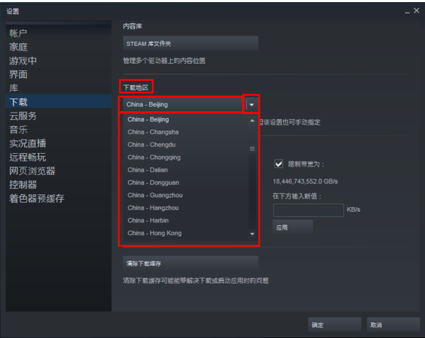 3、在右侧窗格中,单击【下载地区】的下拉菜单。从下拉菜单中选择不同的下载区域,一般国内游戏下载最好的地区是北京、成都。
