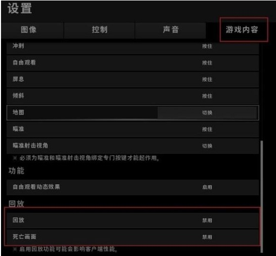 5、如果你的配置不是很高的吧,建议关闭“垂直同步”以及“动作模糊”,将游戏内容中的“回访功能”以及“死亡画面”设置改成“禁用”即可。