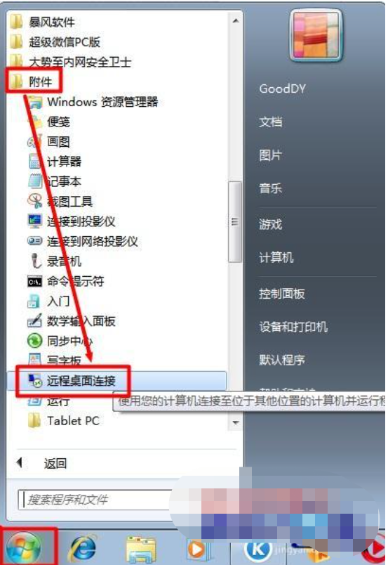 接下来其它用户就可以登陆当前计算机实现远程控制操作,在其它计算机上,点击“开始”、“所有程序”、“附件”、“远程桌面连接”项。