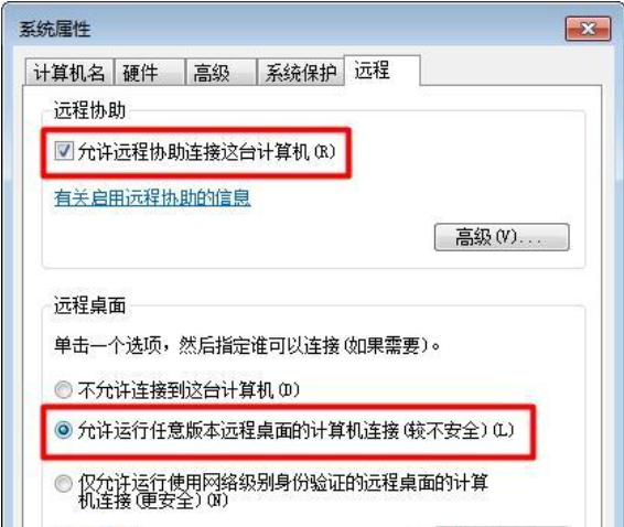 右键点击“计算机”选择“属性”,点击“远程设置”,勾选“允许远程协助连接这台计算机”和“允许远程任意版本的远程桌面的计算机程序”。