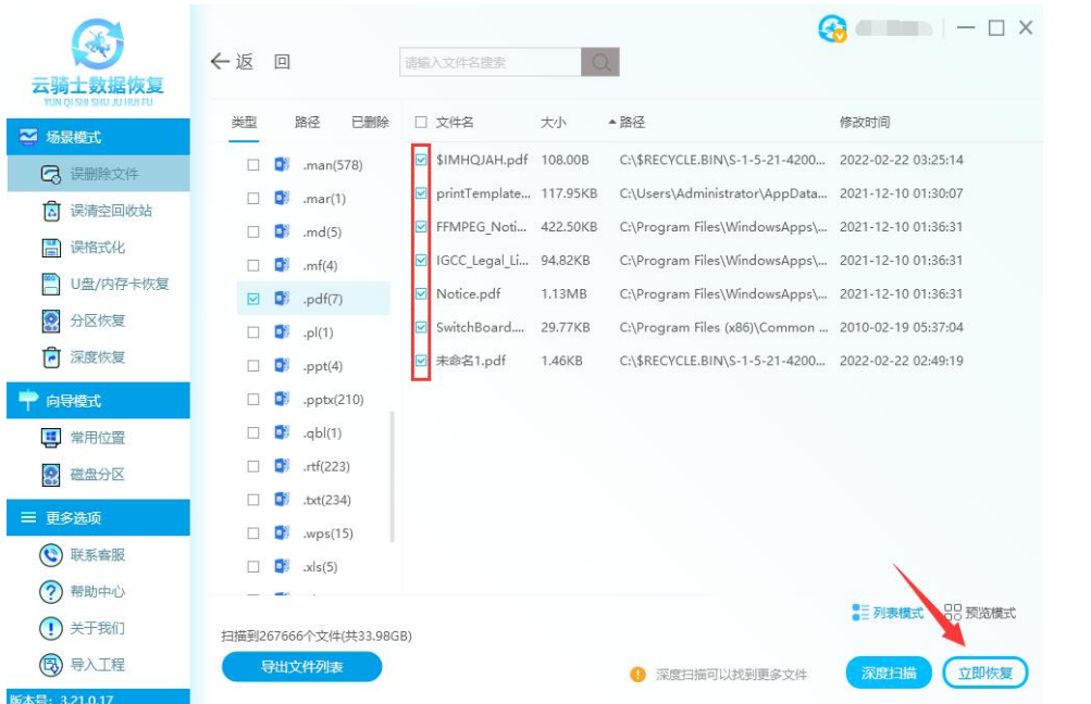 4、扫描完成后,把需要恢复的pdf文件勾选上,再点击右下角底部立即恢复按钮,把数据另存到其他的磁盘即可。