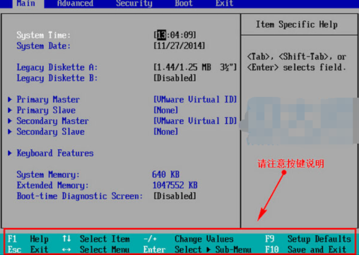 1、进入bios界面设置,在该界面我们要进行几个重要的操作,所以我们要了解界面底部注明:键盘上的方向键进行光标移动;回车键表示“确定”;F10表示“保存并退出”;