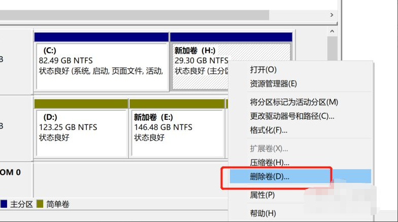 2.进入到磁盘管理界面,鼠标右键点击与C盘相邻的H盘,点击删除卷。