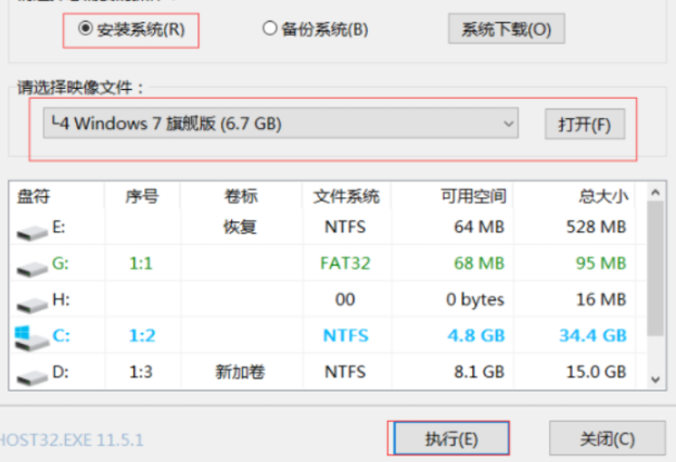 3、打开晨枫一键装机,选择【安装系统】,点击【打开】找到之前下载好的镜像系统点击【执行】。(安装路径一般默认位C盘,不需要重新勾选)。