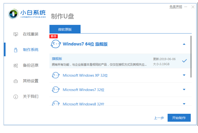 1、免费的电脑重装系统怎么操作呢?我们首先找来一台可用的电脑,在电脑上点击打开下载安装好的小白一键重装系统工具,插入一个8g以上的空白u盘到电脑,选择u盘重装系统模式,点击开始制作。