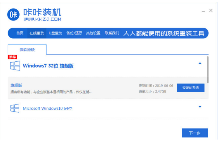 1、联想电脑怎么重装系统呢?首先在电脑上下载安装咔咔装机工具并打开,选择我们需要安装的系统版本,点击下一步。