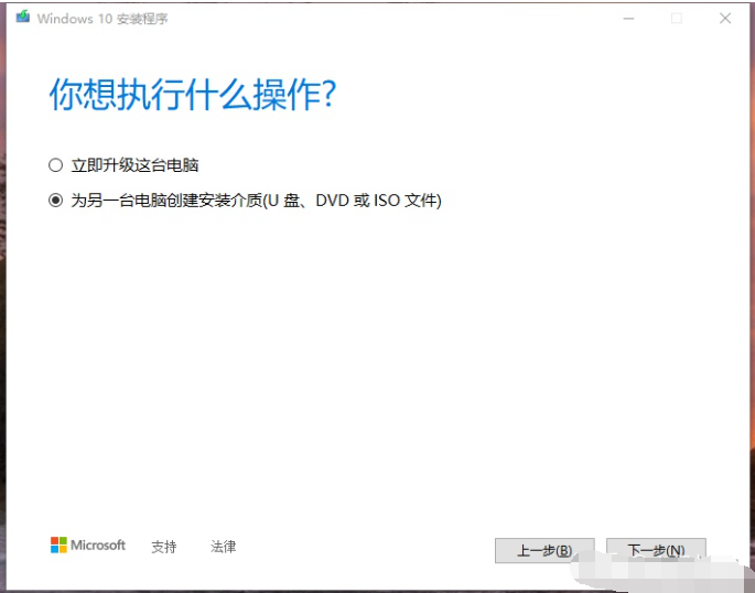 4、点击接受协议进入下一步后,选择为另外一台电脑创建安装介质。