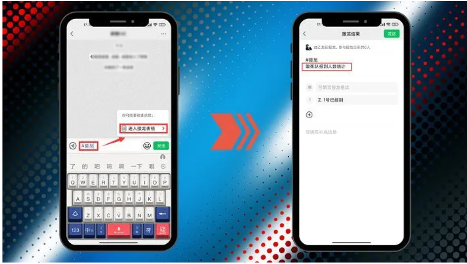 2、在打开的群聊中输入“#接龙”(井号必带),右侧会弹出一个接龙的设置,点进去,在里面设置好接龙的格式后点发送。