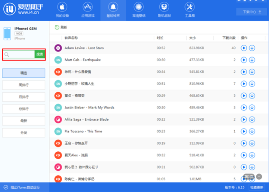 3、进入铃声库以后,如下图所示:左边有搜索框,在各种精选排行里面一眼看不到你喜欢的音乐时,就可以直接搜索。