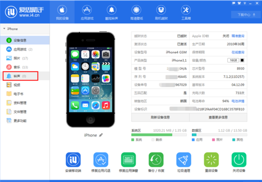 1、首先得在PC端下载安装爱思助手啦!按步骤安装完成以后把手机连接电脑,打开爱思助手客户端,打开左边的“铃声”。