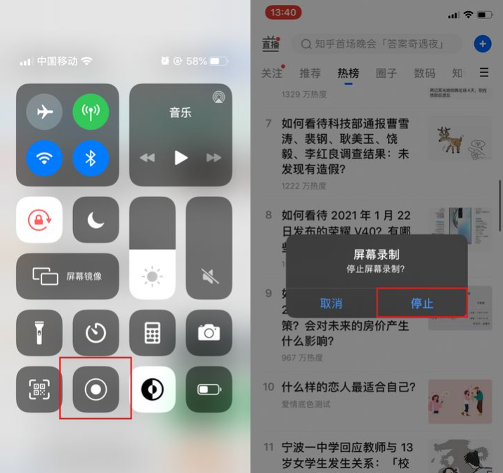 2、需要录屏的时候,直接打开控制中心,点击屏幕录制图标,等待倒计时3秒之后开始录屏。想要结束录屏的话,点击左上方的红色区域,点击停止即可,这样录制的视频就自动保存到相册中了。