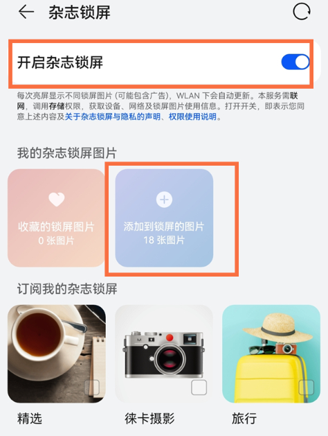 3、开启【开启杂志锁屏】开关,再点击添加到锁屏的图片,选择动态图片即可。