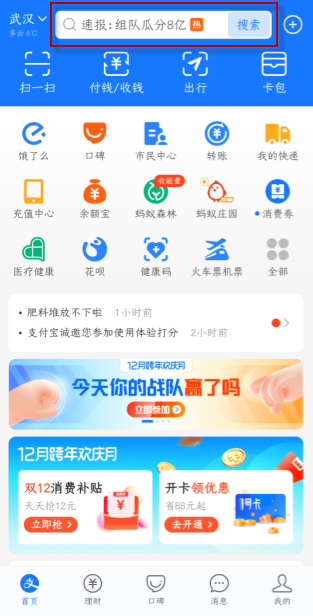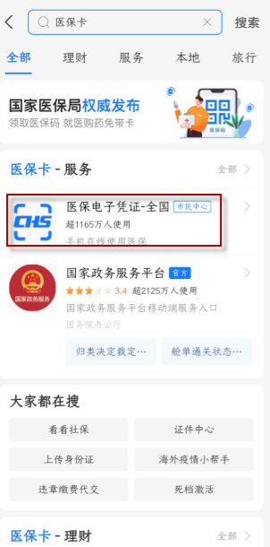 1、首先打开支付宝这个软件,点击顶部的搜索框,接着输入医保卡并搜索,再点击医保电子凭证;