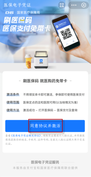 2、进入医保电子凭证页面之后,点击同意协议并激活;