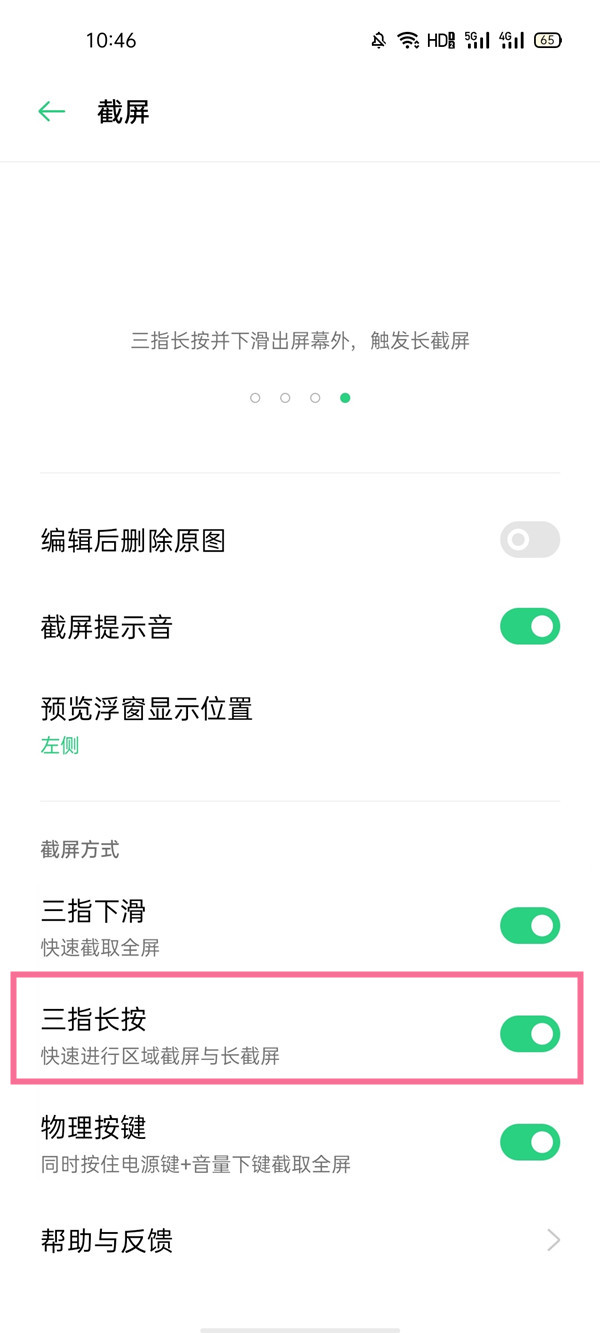 3.开启三指长按截屏。 在需要长截图的页面,三指按住并拖出屏幕即可开始长截图。