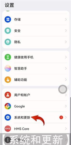 首先打开华为手机系统【设置】图标,然后下拉页面至底部,点击【系统和更新】选项,