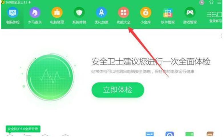 1、打开360卫士,点击功能大全。