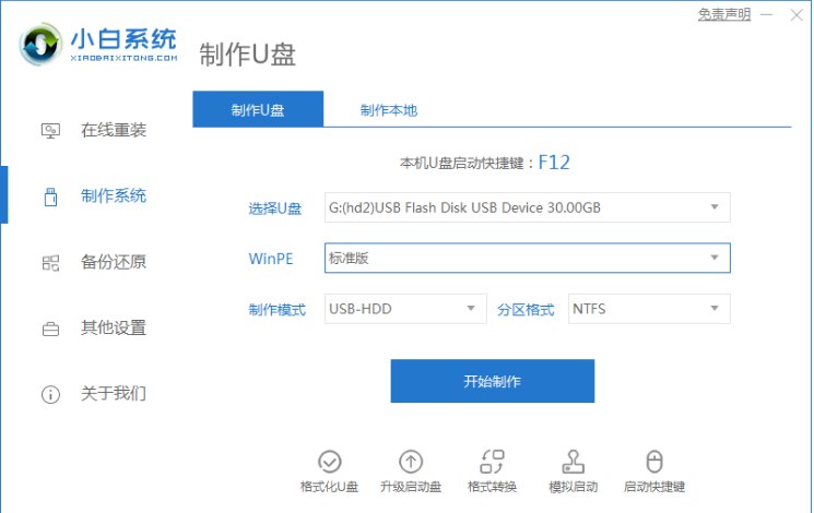 步骤一:我们首先下载小白一键重装系统工具制作U盘启动盘(建议官网下载 ),然后插入U盘,选择U盘模式,点击一键制作U盘启动盘即可。