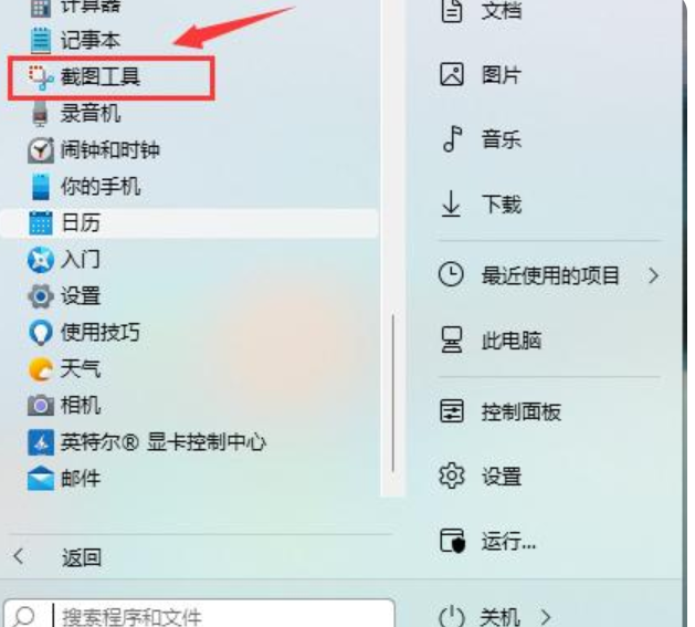 1、点击开始菜单,应用里面找到Win11系统自带的截图工具,如图所示: