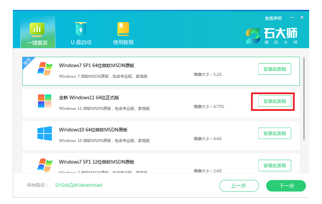 1、下载最新版石大师一键重装系统工具,直接进入选择系统的界面,选Windows11系统进行安装,点击下一步。