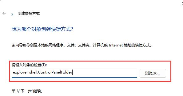 2、创建快捷方式窗口,请键入对象的位置,输入【explorer shell:ControlPanelFolder】进入【下一页】。