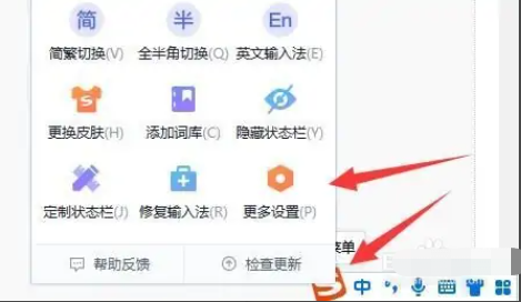 由于大家使用的输入法不太一样,所以我们只能以比较常用的搜狗输入法为例子,首先点击输入法图标,打开“更多设置”