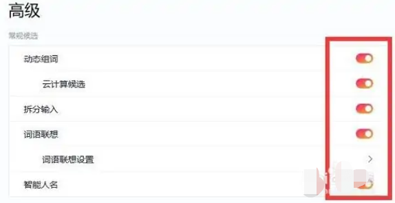 进入后,将“常规候选”中的开关都打开。
