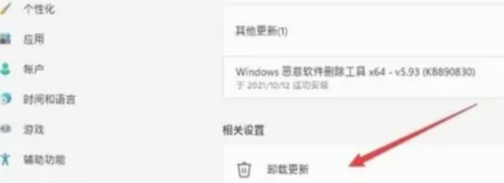 3、然后点击左边栏“Windows更新”,点开相关设置下的“卸载更新”。
