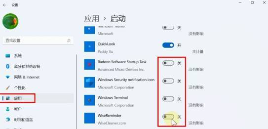 Win+I打开系统设置,点击应用-启动,这个方法可以把一些没有必要的启动程序关掉,以提高运行速度。