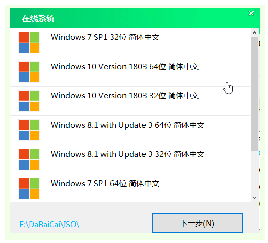 5、在弹出Windows系统在线下载窗口中根据自身需求下载并安装系统版本。